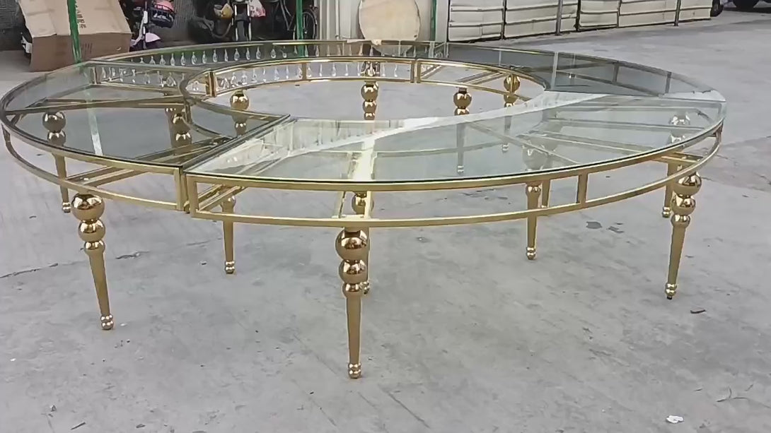 Featuring gold-plated stainless steel frame + transparent glass top, with crystal pendant decor on the edge—it has strong luster, serving as the visual focus of weddings and high-end banquets, instantly creating a luxurious atmosphere.