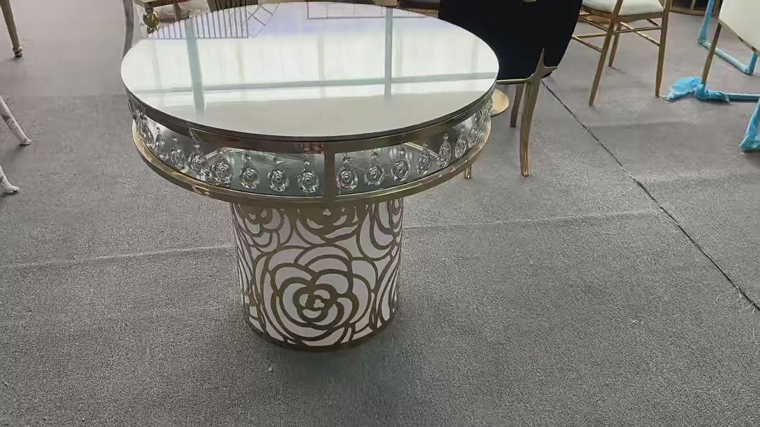 Featuring stainless steel gold-plated frame + transparent glass top, paired with crystal pendant decor and rose hollow base—it exudes luxury texture, serving as the highlight of dessert tables/display tables at weddings and banquets, easily elevating scene style.